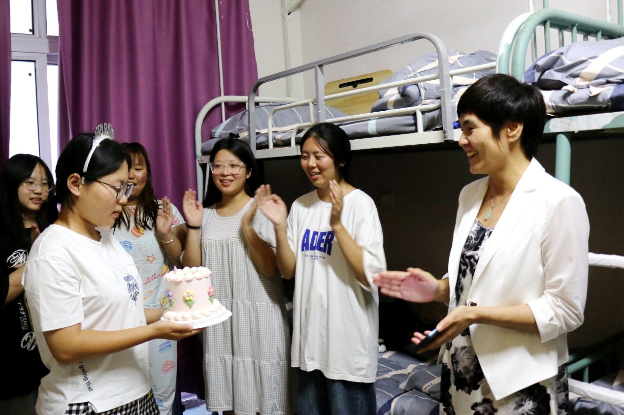 9月17日,党委书记徐锋,校长张军、党委副书记谭红玲、副校长强承魁、纪委书记刘颖带领学工处及七个二级学院的负责人,分别前往大学生公寓看望慰问新同学,并为当天过生日的七名新同学送上生日祝福和生日蛋糕。